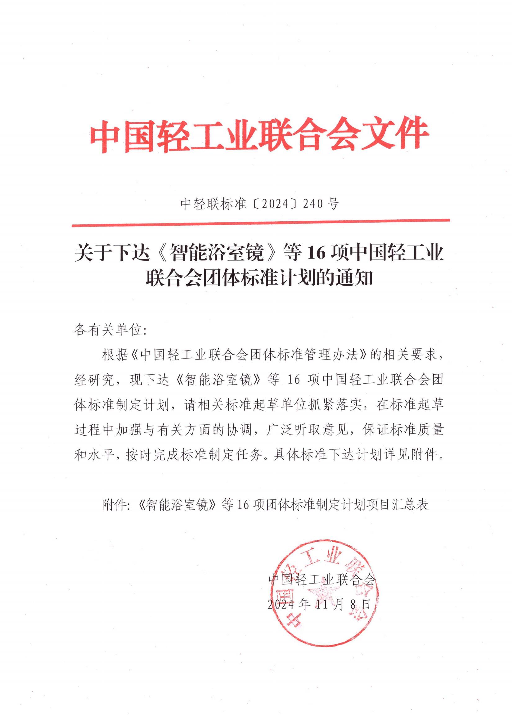 关于下达《智能浴室镜》等16项 团体标准计划的通知