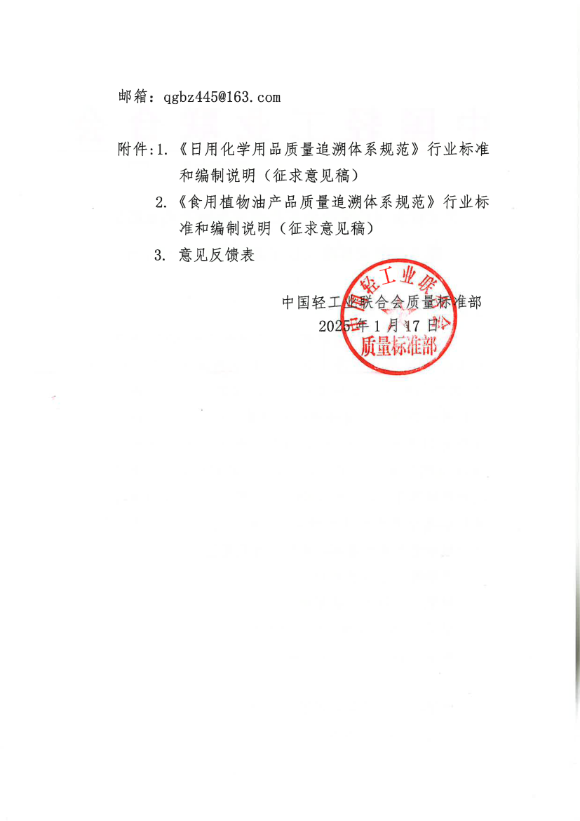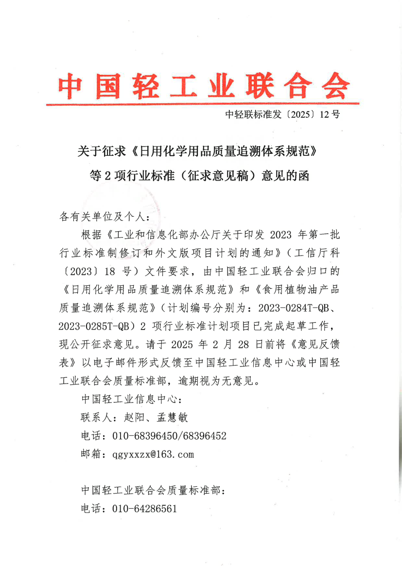 关于征求《日用化学用品质量追溯体系规范》等2项行业标准(征求意见稿)意见的函