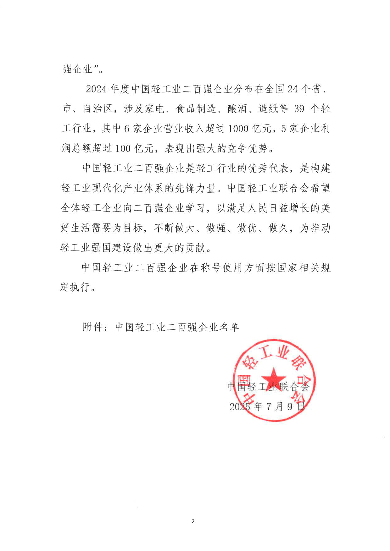 2024年度中国轻工业二百强企业评价结果公告