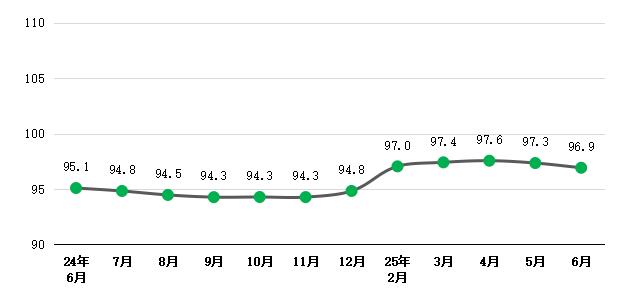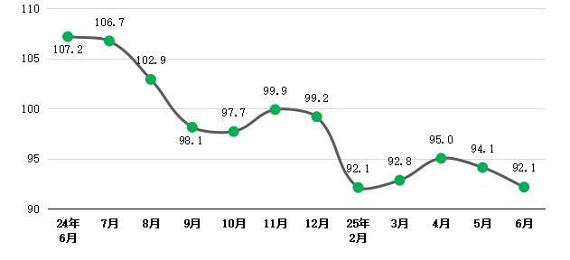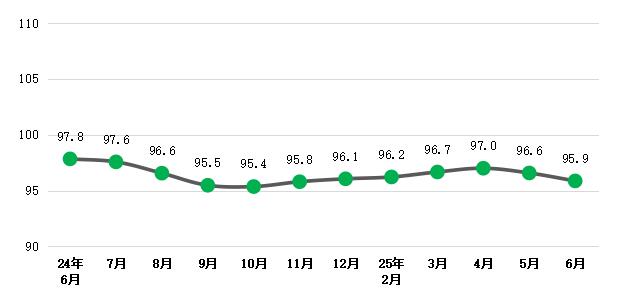 2025年6月,中国轻工业景气指数95.86。2025年上半年,轻工业景气指数各月均在绿色“稳定”区间运行,呈现小幅波动,反映轻工业经济运行综合景气度保持良好水平。6月轻工业景气指数较上年末小幅下降0.19。2024-2025年中国轻工业景气指数月度走势见图一。