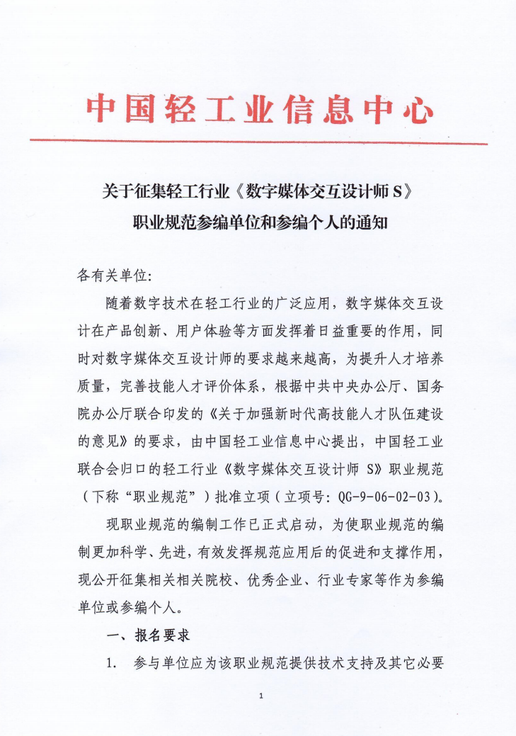 关于征集 《数字媒体交互设计师S》职业规范参编单位和参编个人的通知