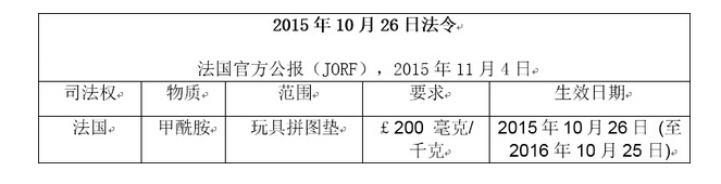 法国近期已将对玩具拼图垫中甲酰胺使用的临时限制延长。延长期限为12个月。新法于2015年10月26日生效。