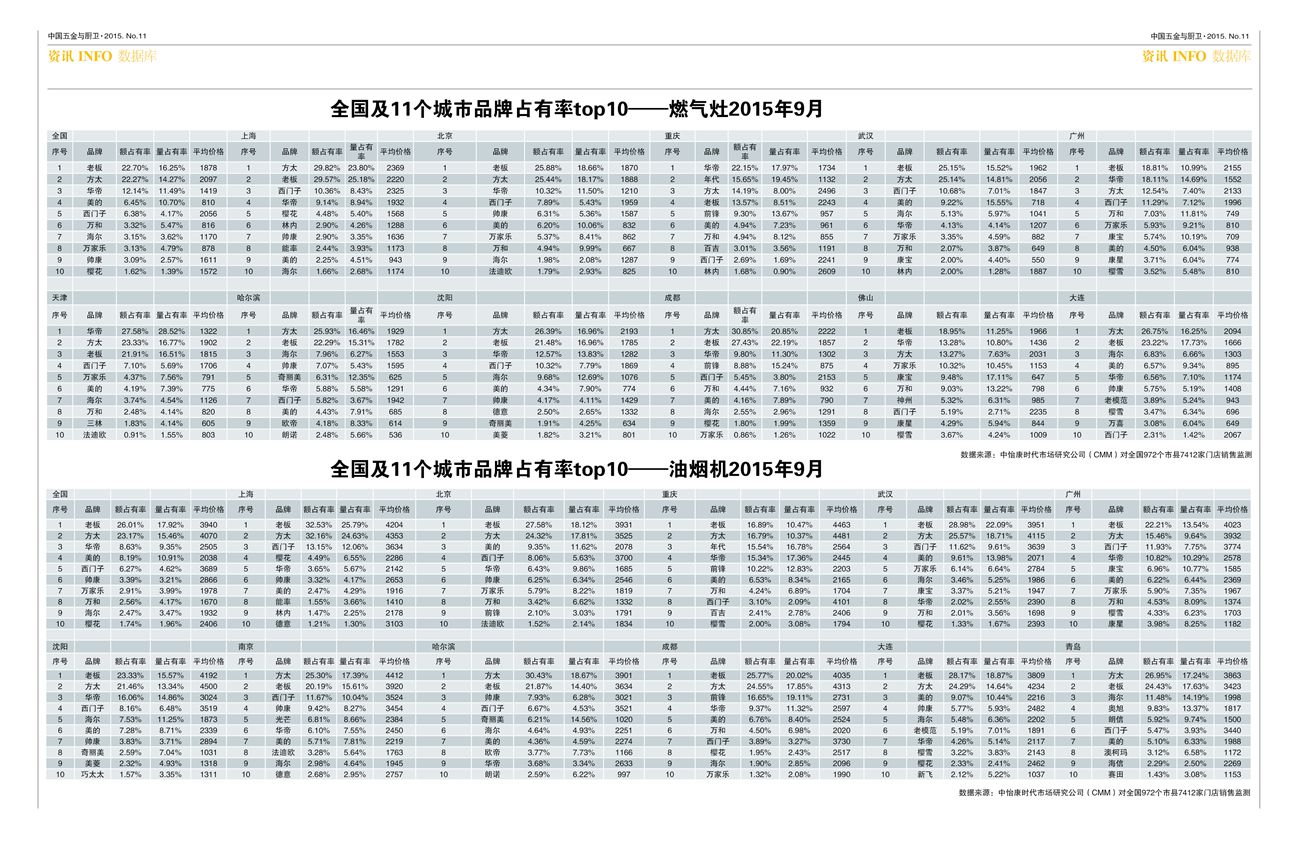 2015年9月全国及11个城市品牌占有率top10-燃气灶/油烟机/热水器/消毒柜