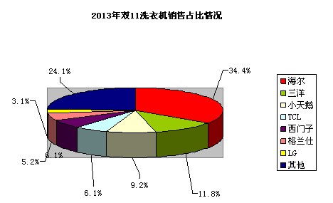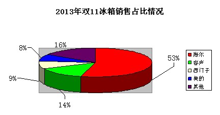 2013年双11,冰箱成交额为2亿元,零售均价2627元,份额占比前三名分别是海尔、容声和西门子,海尔单个品牌就吞食了一大半市场,势头极为凶猛。容声瓜分了13.5%,西门子拿下8.8%份额,白电巨头美的则以7.8个百分点名列第四。其他品牌占比均在2个百分点左右。