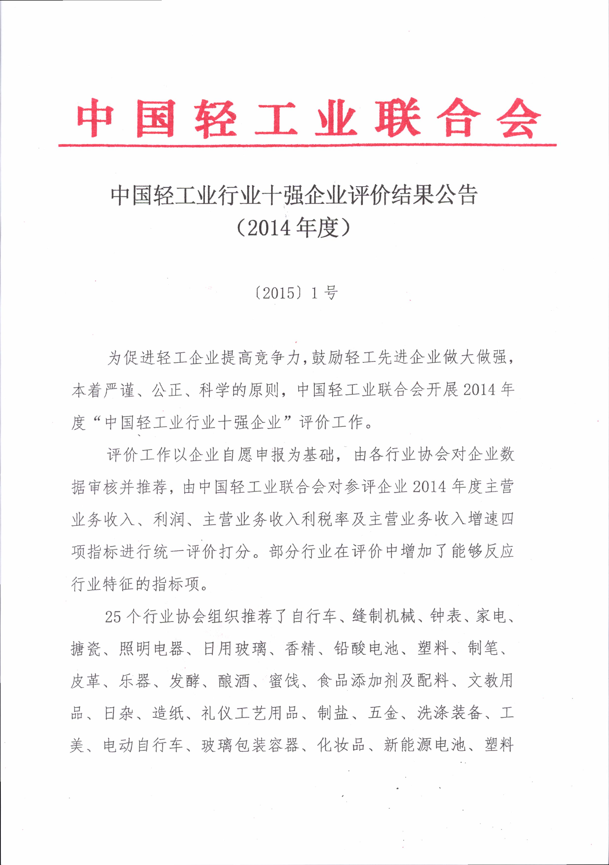 中国轻工业行业十强企业评价结果公告(2014年度)