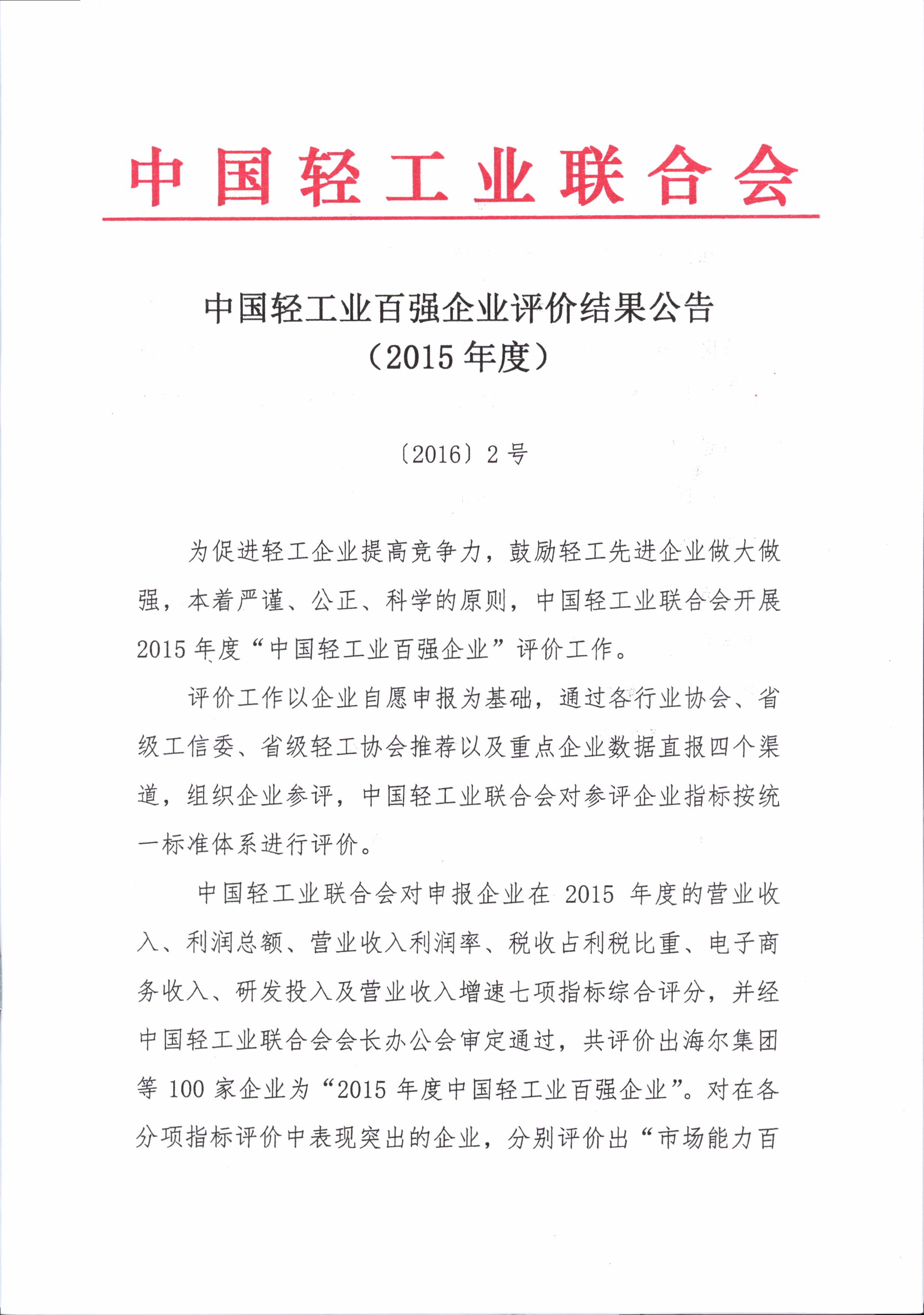 中国轻工业百强企业评价结果公告