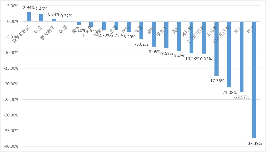 对G20主要成员国进口总额占全部进口的52.09%,同比下降14.17个百分点,进口额同比下降21.97%。其中对法国、巴西、德国、欧盟、英国、阿根廷、美国、澳大利亚等国家进口呈现正增长,从沙特阿拉伯进口同比下降30.16%。