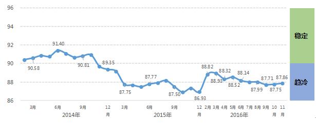 中国轻工业经济运行及预测预警系统数据显示:2016年11月份中轻景气指数为87.86,仍处于蓝色渐冷区间。从本年月度走势看,1-9月轻工景气指数波动下行,9月见底,第四季度开始企稳回升,11月环比上升0.11点。