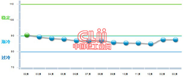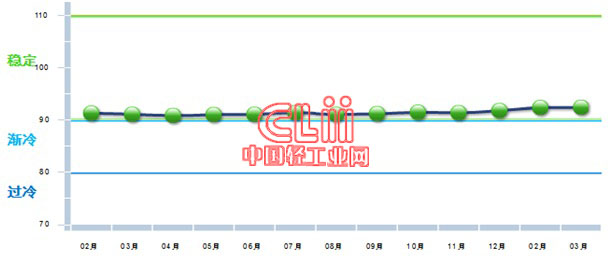 中国轻工业经济运行及预测预警系统数据显示:2017年3月份中轻景气指数为91.08,较上月提高0.69点,该指数自今年年初重回绿色“稳定”区间,说明本年开年,轻工业经济运行有企稳回暖态势。