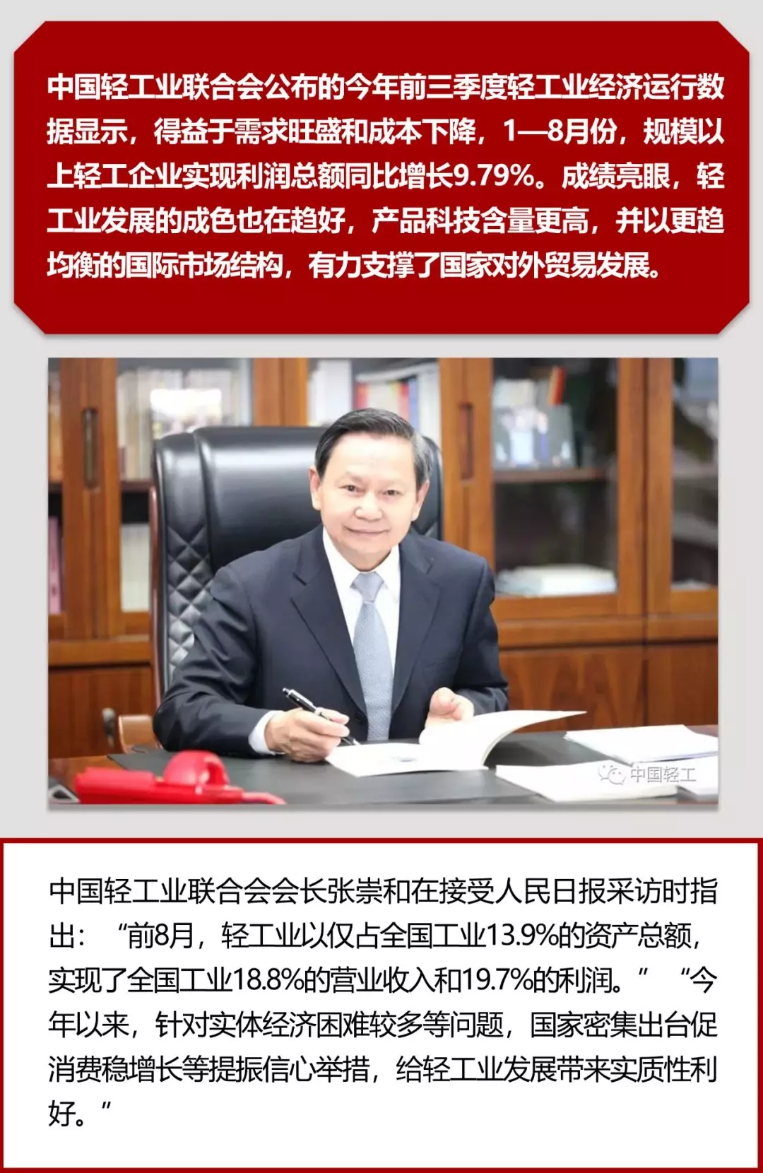 “前8月,轻工业以仅占全国工业13.9%的资产总额,实现了全国工业18.8%的营业收入和19.7%的利润。” 会长张崇和说,从前三季度数据表现来看,轻工业发展韧性特征显著,高质量发展成效突显。