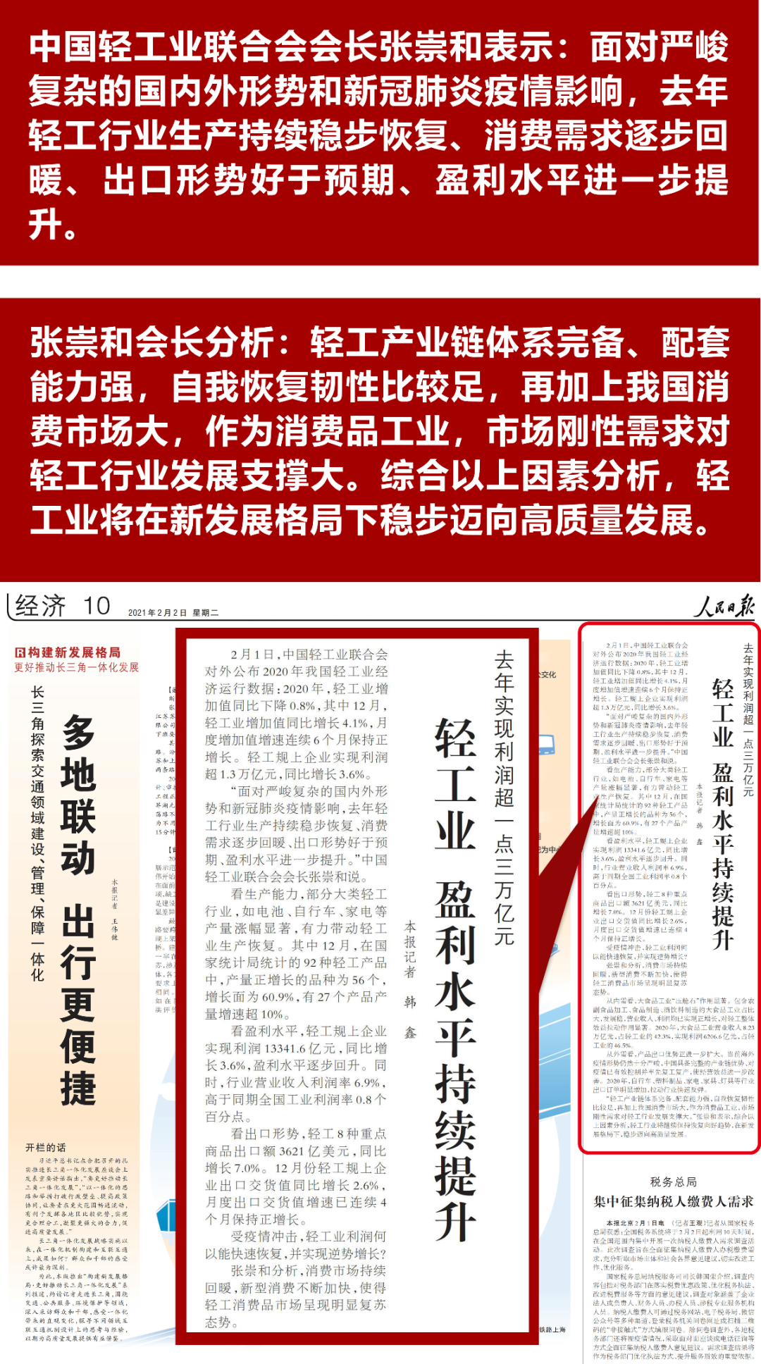 2月2日,人民日报以“轻工业 盈利水平持续提升”为主标题,以“去年实现利润超一点三万亿元”为副标题报道了轻工业经济运行情况。