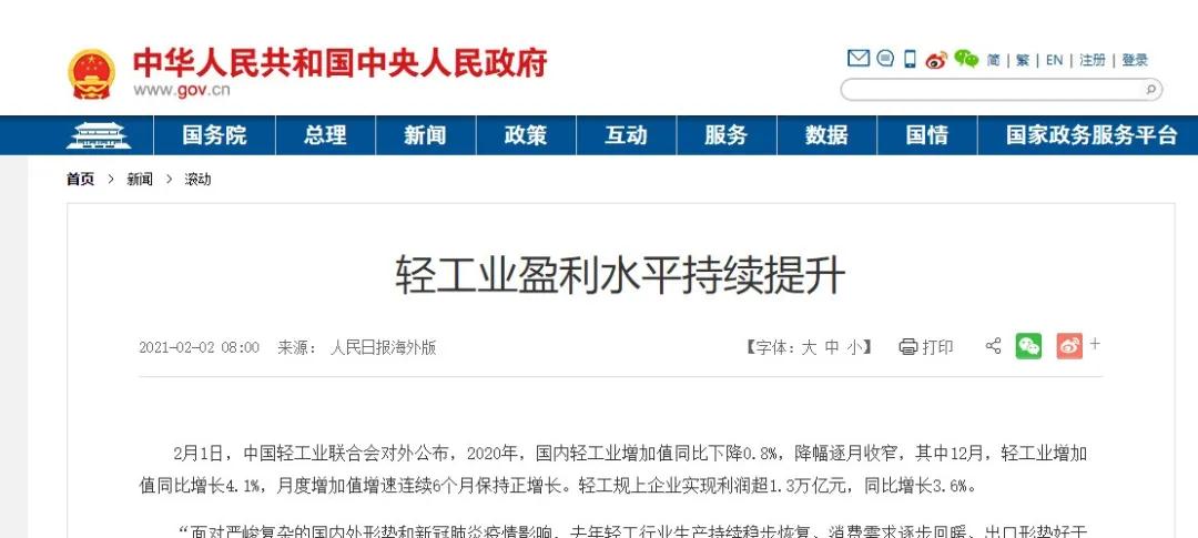 对外公布2020年我国轻工业经济运行数据:2020年,轻工业增加值同比下降0.8%,其中12月,轻工业增加值同比增长4.1%,月度增加值增速连续6个月保持正增长。轻工规上企业实现利润超1.3万亿元,同比增长3.6%。
