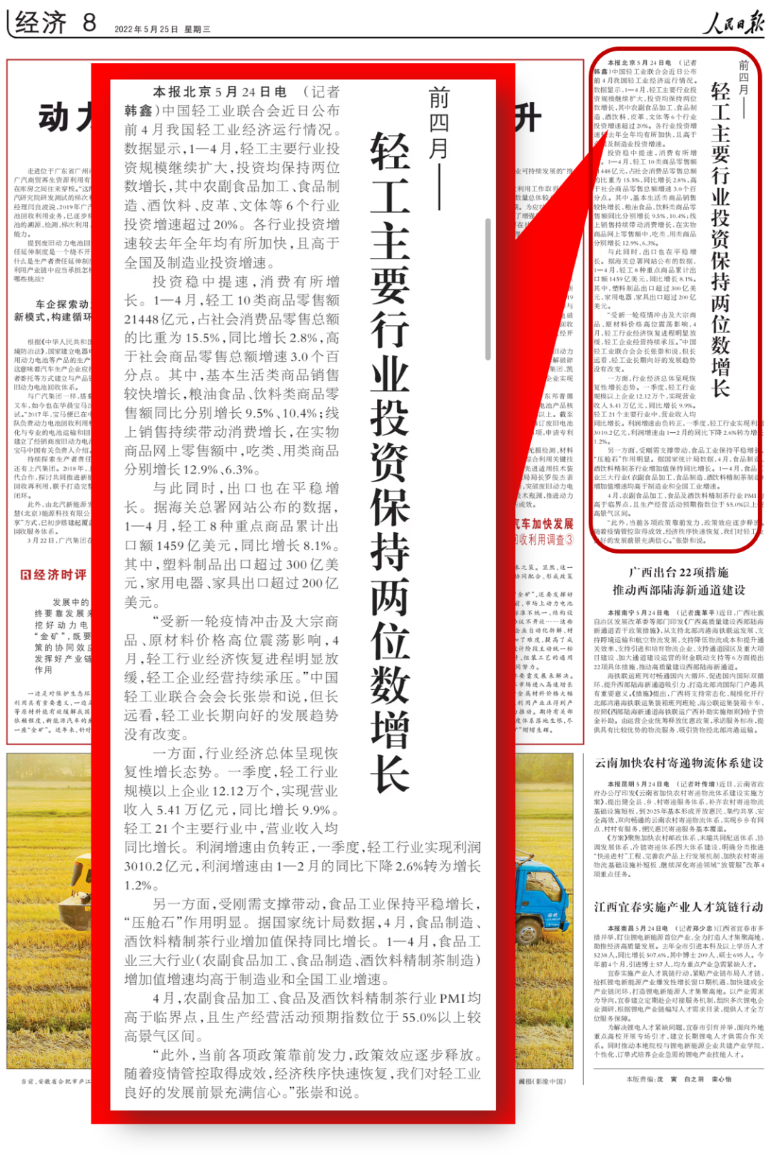 人民日报:前四月——轻工主要行业投资保持两位数增长