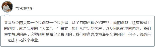 穿过研发中心厨房电器、洗衣机等产品的展示区域,斐雪派克首席执行官布罗德赫斯特告诉我们,当天首先向李克强总理介绍斐雪派克融入海尔集团大家庭的情况。