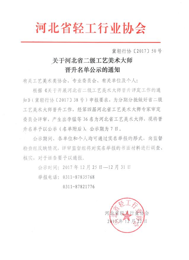 据悉,本届河北省工艺美术大师评选根据省政府办公厅(冀政办〔2013〕17号)和省工信厅《关于“河北省传统工艺美术大师评选”事项转由省