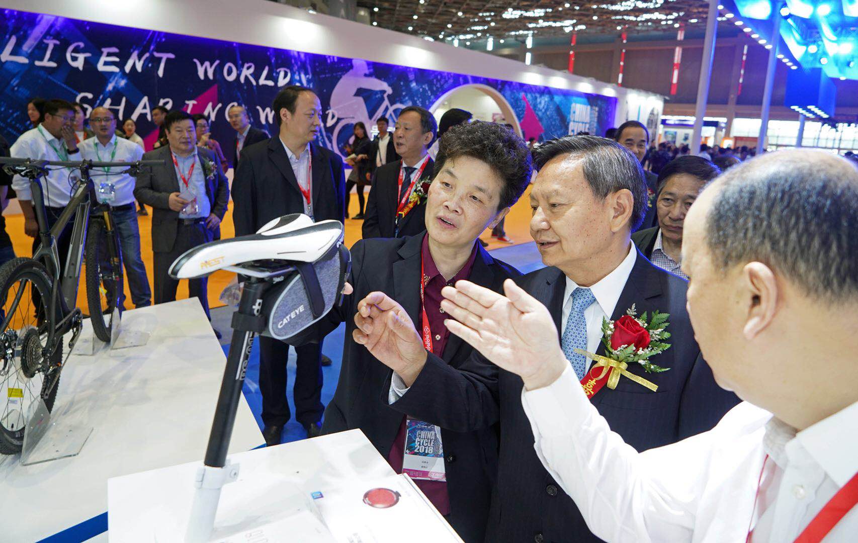 张崇和首先来到2018创新奖评选作品展台。作为行业发展的年度风向标,这里既有自行车整车、电动自行车,也有自行车飞轮等零部件,还有户外骑行用具等配饰。张崇和不时停下脚步仔细观看,认真听取工作人员讲解,还用单手提起一辆碳纤维材料自行车亲自体验轻量化设计,并仔细询问自行车破风能力。当得知该展台产品是因为设计、功能、材料、市场、创新等五大方面因素而获奖时,张崇和表示,这些产品真实展现了我国自行车行业在产品设计、制造工艺、应用材料等领域的创新能力和研发转化力,以高端化、智能化助力行业自主品牌扩大了影响力,提升了竞争力。协会要积极践行“三品”战略,加强新产品的年度统计工作,引导行业不断推出新产品、好产品。