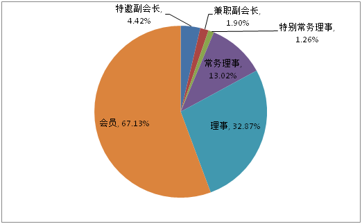特邀副会长单位35家,占会员总数的4.42%;兼职副会长单位15家,占会员总数的1.90%;特别常务理事单位10家,占会员总数的1.26%;常务理事单位103家,占会员总数的13.02%;理事单位260家,占会员总数的32.87%;普通会员单位531家,占会员总数的67.13%。