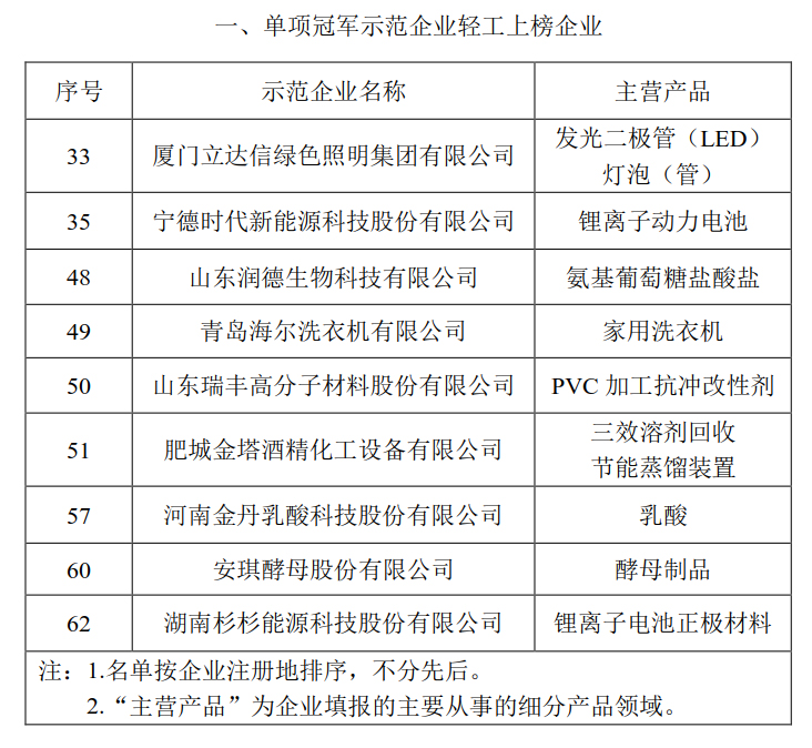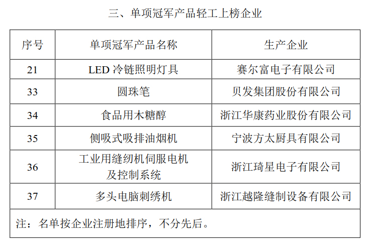 漳州立达信绿色照明集团有限公司、山东润德生物科技有限公司等9家轻工企业入选制造业“单项冠军示范企业”;浙江欧诗漫集团有限公司、保龄宝生物股份有限公司等7家轻工企业入选制造业“单项冠军培育企业”;贝发集团股份有限公司等轻工企业生产的“圆珠笔”、“食用木糖醇”等6个产品入选制造业“单项冠军产品”。