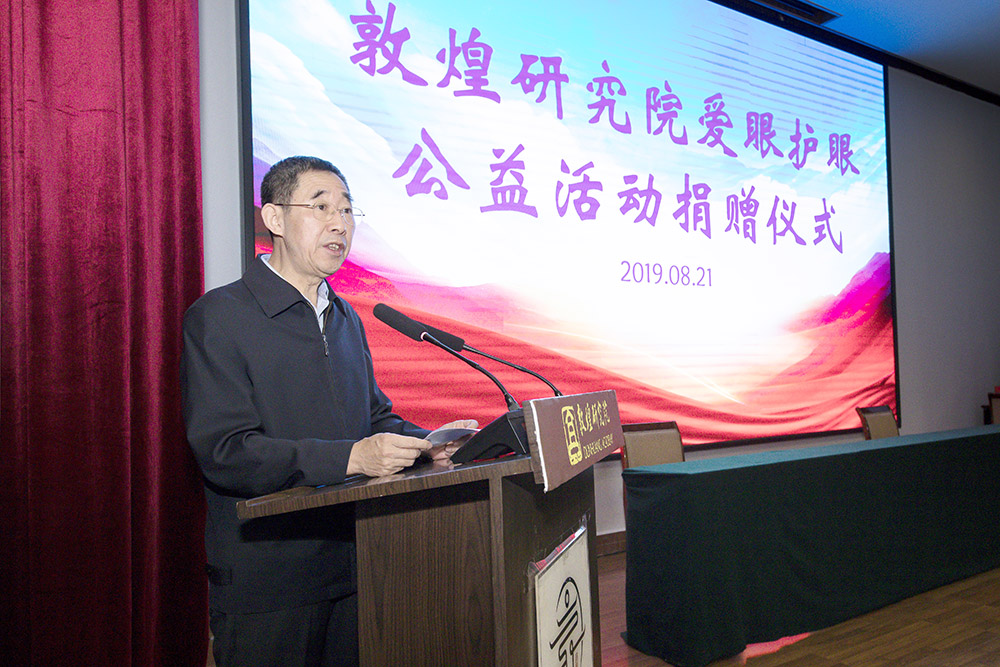 敦煌研究院院长赵声良在答谢词中首先向长期关心支持敦煌文物保护事业的各界人士表示感谢。他指出:“一代代莫高窟人发扬坚守大漠、甘于奉献、勇于担当、开拓进取的莫高精神,敦煌文化遗产事业取得了很大的成就。昨天,习近平总书记来研究院考察时,对文化遗产保护、研究、弘扬工作给予了充分肯定。 、中国眼镜协会捐赠活动惠及研究院每一位职工,充分体现了眼镜企业在受益的同时不忘社会责任和担当。