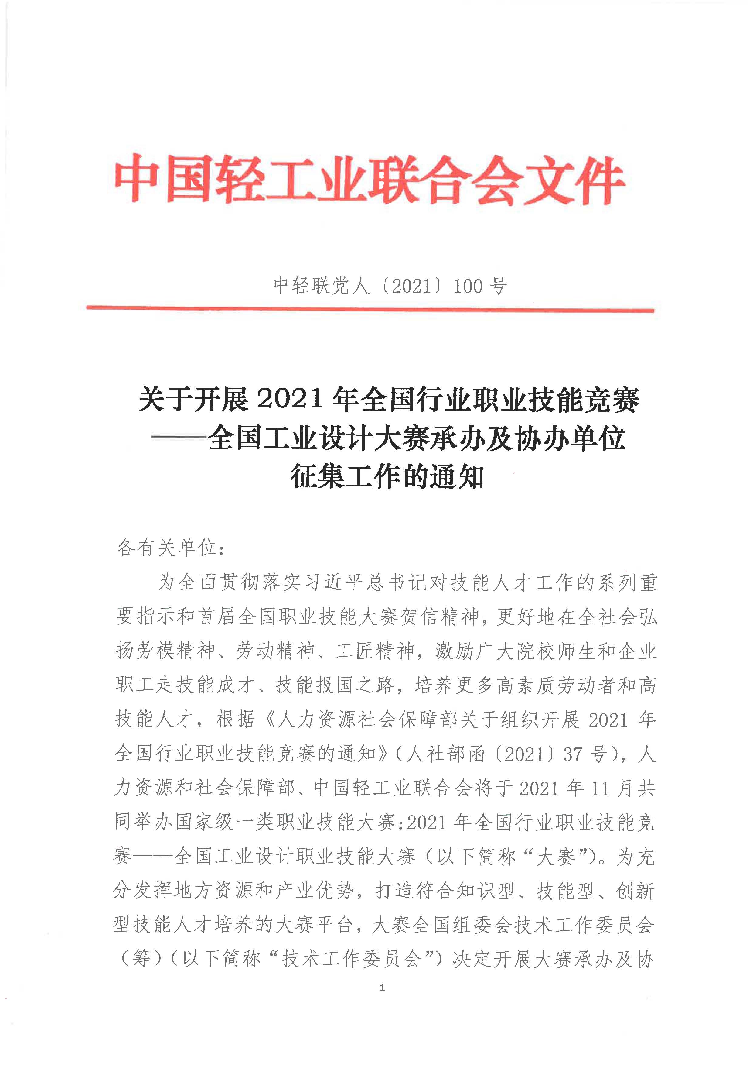 关于开展2021年全国行业职业技能竞赛——全国工业设计大赛承办及协办单位征集工作的通知
