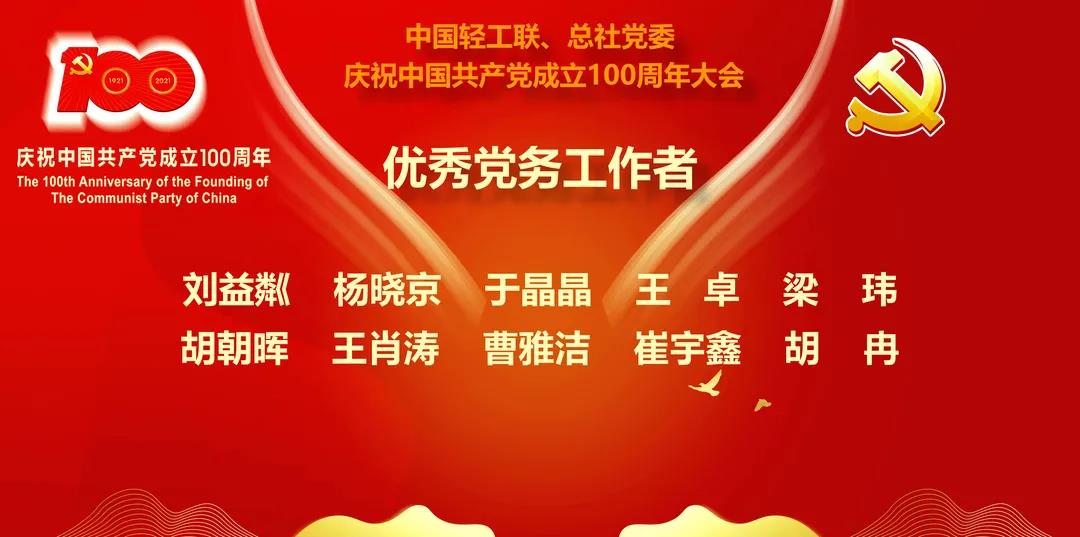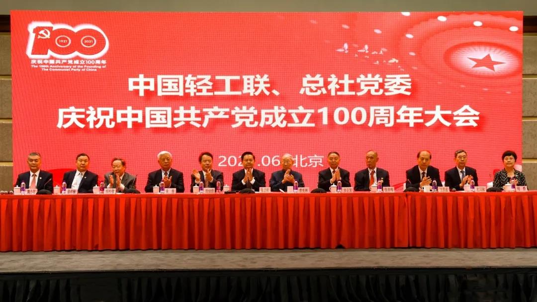 在全国上下喜迎建党百年的历史时刻,在全党深入开展党史学习教育的重要节点,6月29日,中国轻工联、总社党委在京召开庆祝中国共产党成立100周年大会,重温党的历史,总结“两化”经验,表彰先进典型,为“光荣在党50年”的老党员颁发纪念章,为新党员举行入党宣誓仪式。