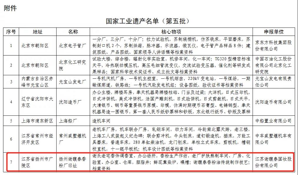 近日,工业和信息化部公布“第五批国家工业遗产”名单,其中轻工领域国家工业遗产共计6项,分别为江苏扬州谢馥春香粉厂旧址、山东烟台醴泉啤酒股份有限公司旧址、广东江门甘蔗化工厂、广东清远英德红旗茶厂、四川遂宁卓筒井和蓬基井、陕西宝鸡西凤酒厂,涉及日化、酒水、制盐、糖茶等传统 。