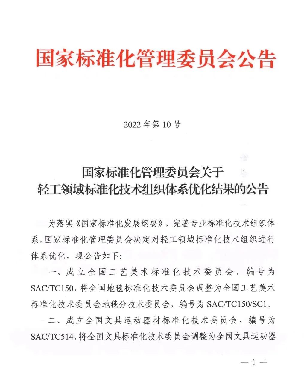 在国家标准化管理委员会的指导下,中国轻工联高度重视轻工领域标准化技术组织建设,张崇和会长多次主持会长办公会议,专题研究审议轻工标准化技术组织体系优化工作。经第四届中国轻工联第117次会长办公会、第五届中国轻工联第5次会长办公会审议同意并向国家标准委申请,2022年6月3日国家标准化管理委员会发布《关于轻工领域标准化技术组织体系优化结果的公告》,正式批复成立全国工艺美术标准化技术委员会、全国日用杂品标准化技术委员会、全国眼视光标准化技术委员会、全国文具运动器材标准化技术委员会等4个标准化技术委员会;同时调整全国地毯标准化技术委员会、全国文具标准化技术委员会等2个标准化技术委员会;撤销全国刷类标准化技术委员会、全国民用装饰镜标准化技术委员会等10个标准化技术委员会和分技术委员会。