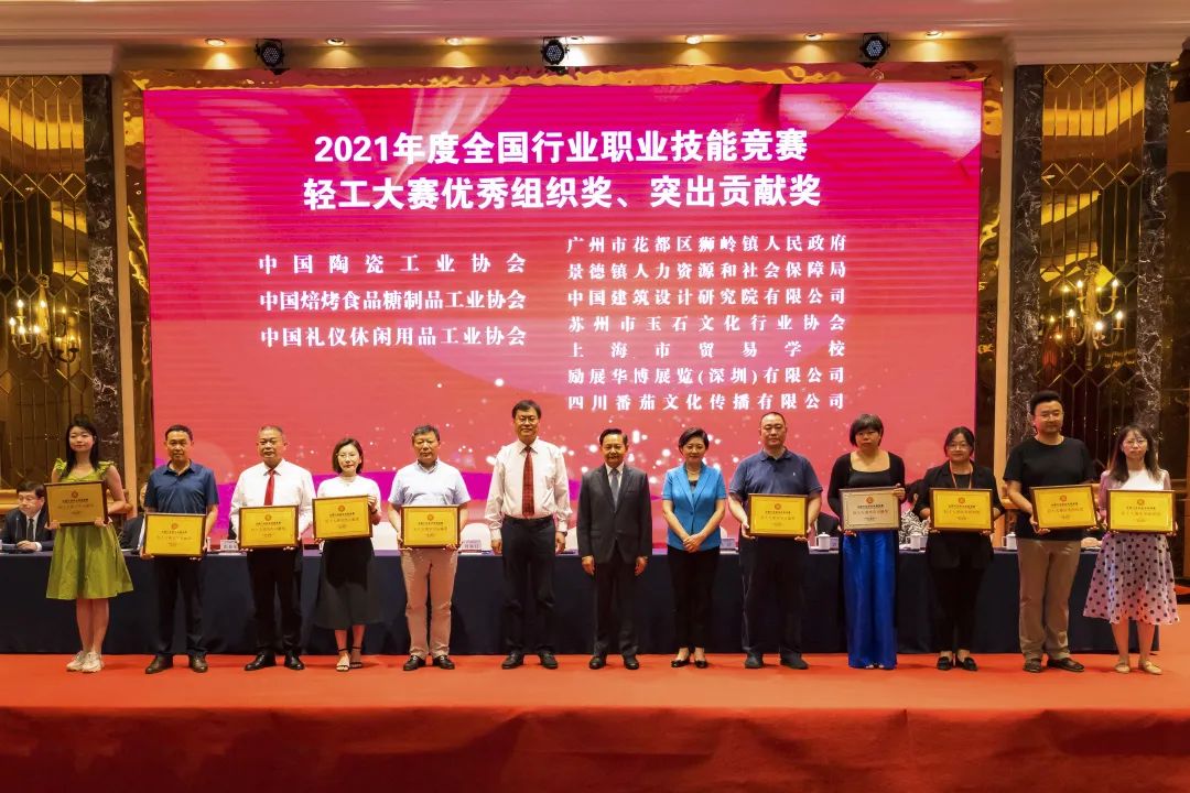 大会授予中国陶瓷工业协会等3家单位2021年度全国行业职业技能竞赛轻工大赛优秀组织奖;授予广州市花都区狮岭镇人民政府等7家单位2021年度全国行业职业技能竞赛轻工大赛突出贡献奖;授予五粮液集团有限公司“全国轻工技能大赛战略联盟企业”称号。