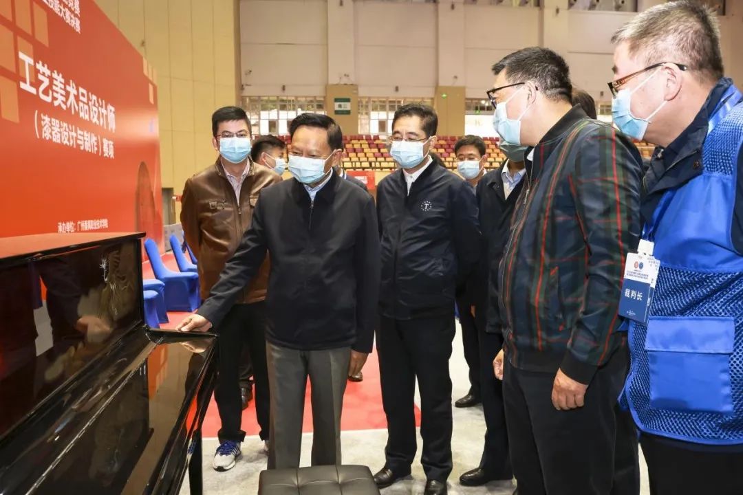 张崇和一行先后来到宝石琢磨工(宝石琢型设计与加工)、工艺美术品设计师(漆器设计与制作)和室内装饰设计师(室内陈设与空间设计)三大赛项决赛现场,听取了各赛项裁判长对参赛人数、比赛时长、比赛规程以及评分制度的介绍,详细了解了大赛情况,并对各赛项提升赛程规范水平,加快选手设计成果转化,推动