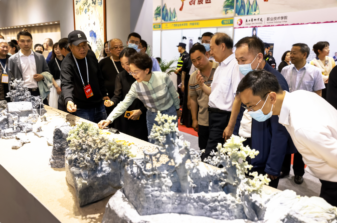 随后卢卫生一行参观了潮州、北京、广西、浙江、福州、醴陵等特色展团。在中国工艺美术大师伍炳亮展位,领导们详细了解海南黄花梨、越南黄花梨、小叶紫檀、老红酸枝等传统家具的技艺传承。在大师工匠非遗精品展区,领导们纷纷为我国工艺美术传承创新取得的成就而赞叹,表示本届博览会展品精美、各具特色,全面展示了我国工艺美术行业新时代发展风貌,为推动我国传统手工艺传承创新提供了高规格平台。