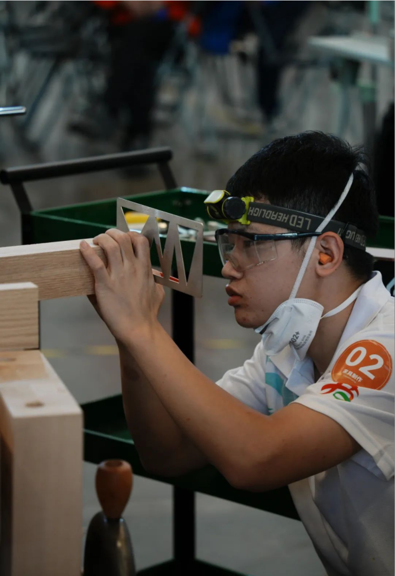 图为轻工代表队选手赵叙含参加木工项目世赛选拔。该赛项比拼选手使用精密工具切割、确保修整和造型细节的精准性,完成粗精加工并确保工作测量、剪切的准确性等能力。