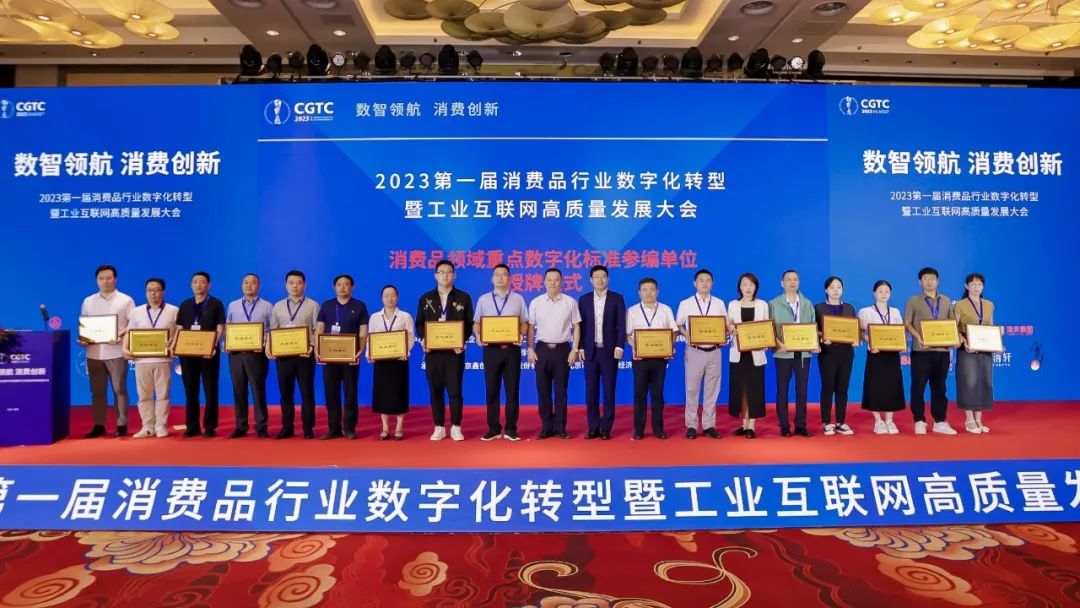 大会为2023年度消费品行业数字化转型先进示范案例和重点数字化标准参编单位颁发了牌证。