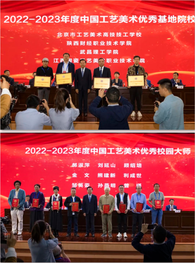 中国工艺美术大师工作委员会于2019年启动 “百名大师进校园活动”。自活动开展以来,基地院校和大师开展了有效合作,培养院校青年人才工作取得积极成效。大会对2022-2023年度中国工艺美术优秀基地院校和优秀校园大师进行表彰。授予北京市工艺美术高级技工学校等4所院校“2022-2023年度中国工艺美术优秀基地院校”称号,授予郝淑萍等9人“2022-2023年度中国工艺美术优秀校园大师”称号。