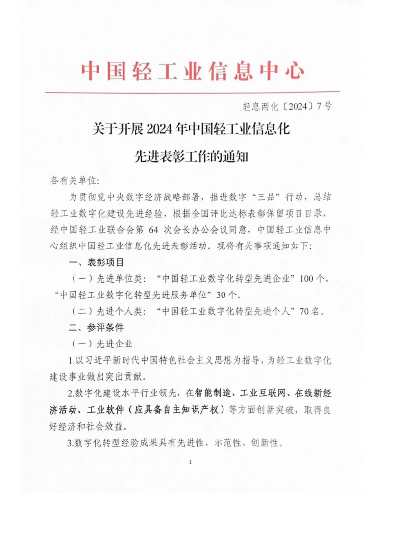 本次评选表彰工作申报阶段拟于5月中旬左右结束,主要通过国家级 组织、省级 主管部门推荐、重点单位直接报送方式申报评选。最终将评出轻工业数字化转型先进企业100家、先进服务机构(公共服务平台)30家、先进个人70名。