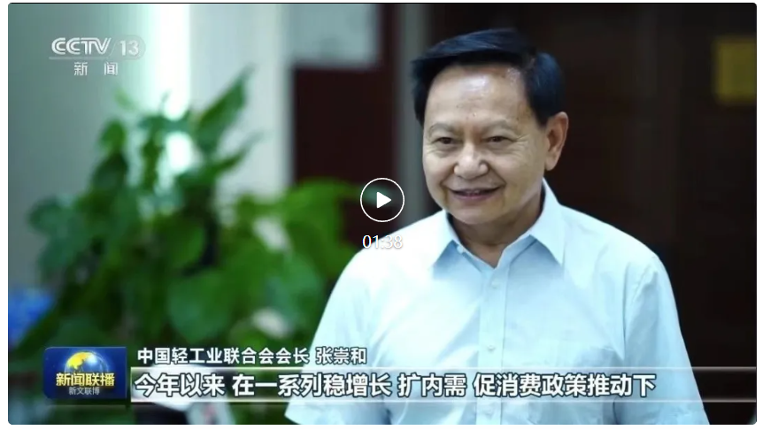 8月12日,央视《新闻联播》播报上半年轻工业经济运行良好态势,张崇和会长在接受专访时指出,今年以来,在一系列稳增长、扩内需、促消费政策推动下,轻工业经济运行回升向好,生产较快增长,市场稳步扩大,盈利水平提升,投资大幅增加,新质发展动能增强。(全文如下)