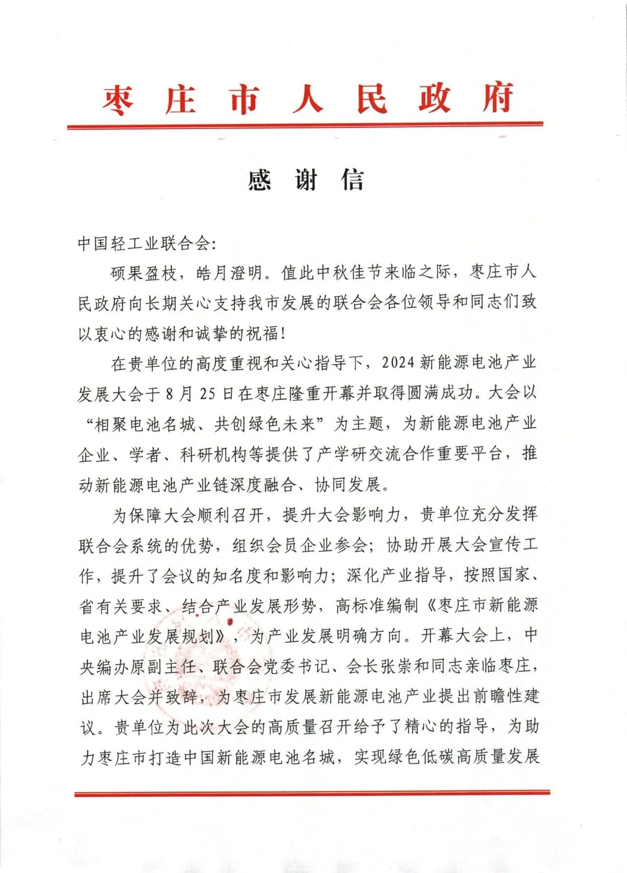 编者按:新能源电池产业是轻工业的重要组成部分,是落实国家双碳战略的重要支撑力量。枣庄市新能源电池产业发展环境优越,产业基础扎实,创新活力充足,政策保障有力,是当地能源绿色低碳转型的主导性产业。根据枣庄市委市政府的需要, 大力支持枣庄市新能源电池产业发展,指导举办新能源电池产业发展大会,张崇和会长亲临大会并致辞,为产业发展提出前瞻性建议;高标准编制《枣庄市新能源电池产业发展规划》,为产业更高质量发展提供了行动指南。对此,枣庄市人民政府发来感谢信,对 的指导和支持表示诚挚感谢。枣庄市人民政府的感谢信,激励我们今后要更好服务于地方轻工产业的转型升级和高质量发展。 将继续通过科技创新、标准质量、绿色智慧、三品行动、产业集群、技能人才等六大举措,助力枣庄市打造新能源电池新质集群,树立资源型城市转型典范,为当地经济社会高质量发展作出更大贡献!