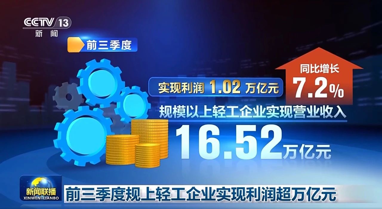 11月13日,央视《新闻联播》播报今年前三季度轻工业经济运行良好态势。报道指出,今年前三季度,我国规模以上轻工企业实现营业收入16.52万亿元,实现利润1.02万亿元,同比增长7.2%。(全文如下)