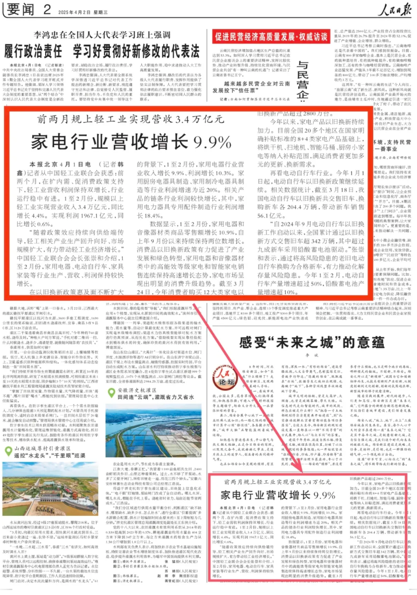 4月2日,《人民日报》要闻版报道今年前两月轻工业经济运行良好态势。报道指出,前两个月,在扩内需、促消费政策支持下,轻工业营收利润保持双增长,行业运行稳中有进。1至2月份,规模以上轻工业实现营业收入3.4万亿元,同比增长4.4%。实现利润1967.1亿元,同比增长0.6%。(全文如下)