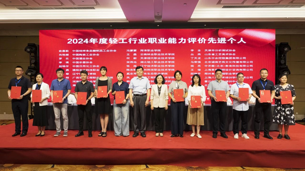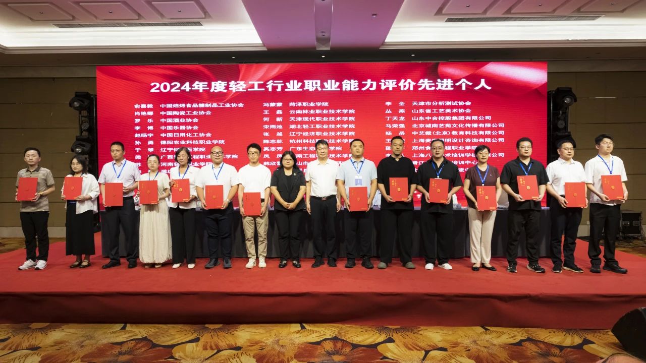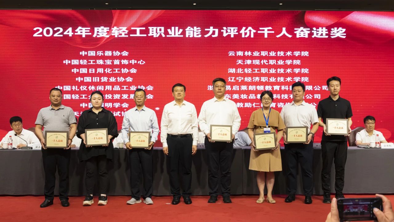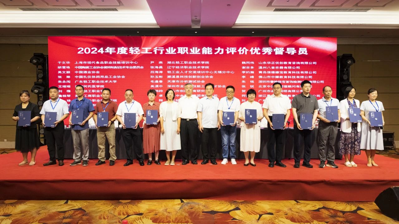 大会授予中国焙烤食品糖制品工业协会等6家单位“2024年度轻工职业能力评价千人卓越单位”称号;授予中国酒业协会等6家单位“2024年度轻工职业能力评价千人优秀单位”称号;授予中国乐器协会等15家单位“2024年度轻工职业能力评价千人奋进单位”称号;授予义乌市工艺美术行业协会等3家单位“2024年度轻工职业能力评价特色培训基地”称号;授予俞嘉毅等30人“2024年度 职业能力评价先进个人”称号;授予戎小龙等30人“2024年度 职业能力评价优秀考评员”称号;授予干文华等30人“2024年度 职业能力评价优秀督导员”称号;授予中国轻工珠宝首饰中心等13家单位“轻工业职业标准、评价规范工作优秀组织单位”称号;授予张帅等82人“全国 国家职业标准工作优秀个人”称号;授予徐力等26人“全国 评价规范工作优秀个人”称号。