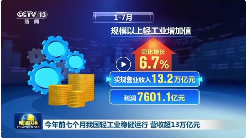 中央媒体:前7月规上轻工企业实现营收同比增长4.1%