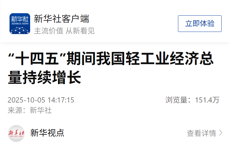 新华社:“十四五”期间我国轻工业经济总量持续增长