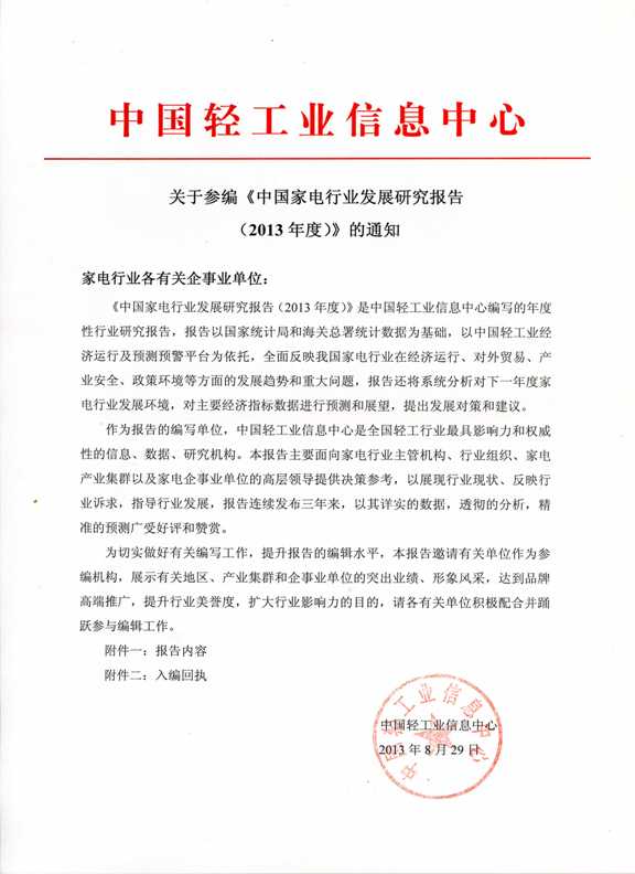关于参编《中国家电行业发展研究报告(2013年度)》通知