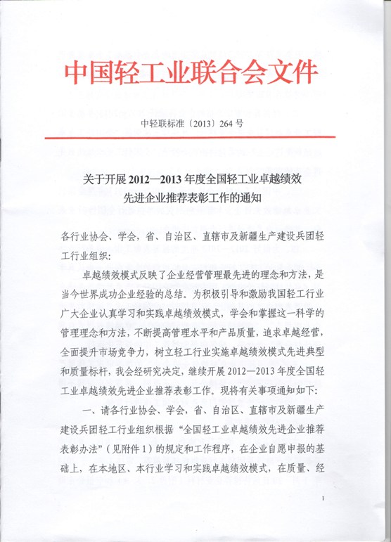 | 1、 | 关于开展2012—2013年度全国轻工业卓越绩效先进企业推荐表彰工作的通知 |