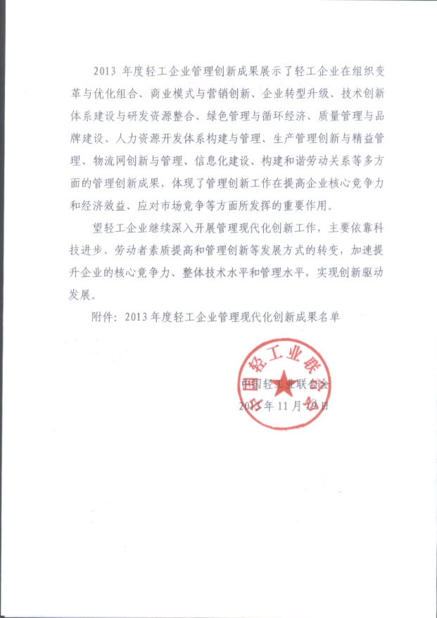 关于发布2013年度轻工企业管理现代化创新成果的决定