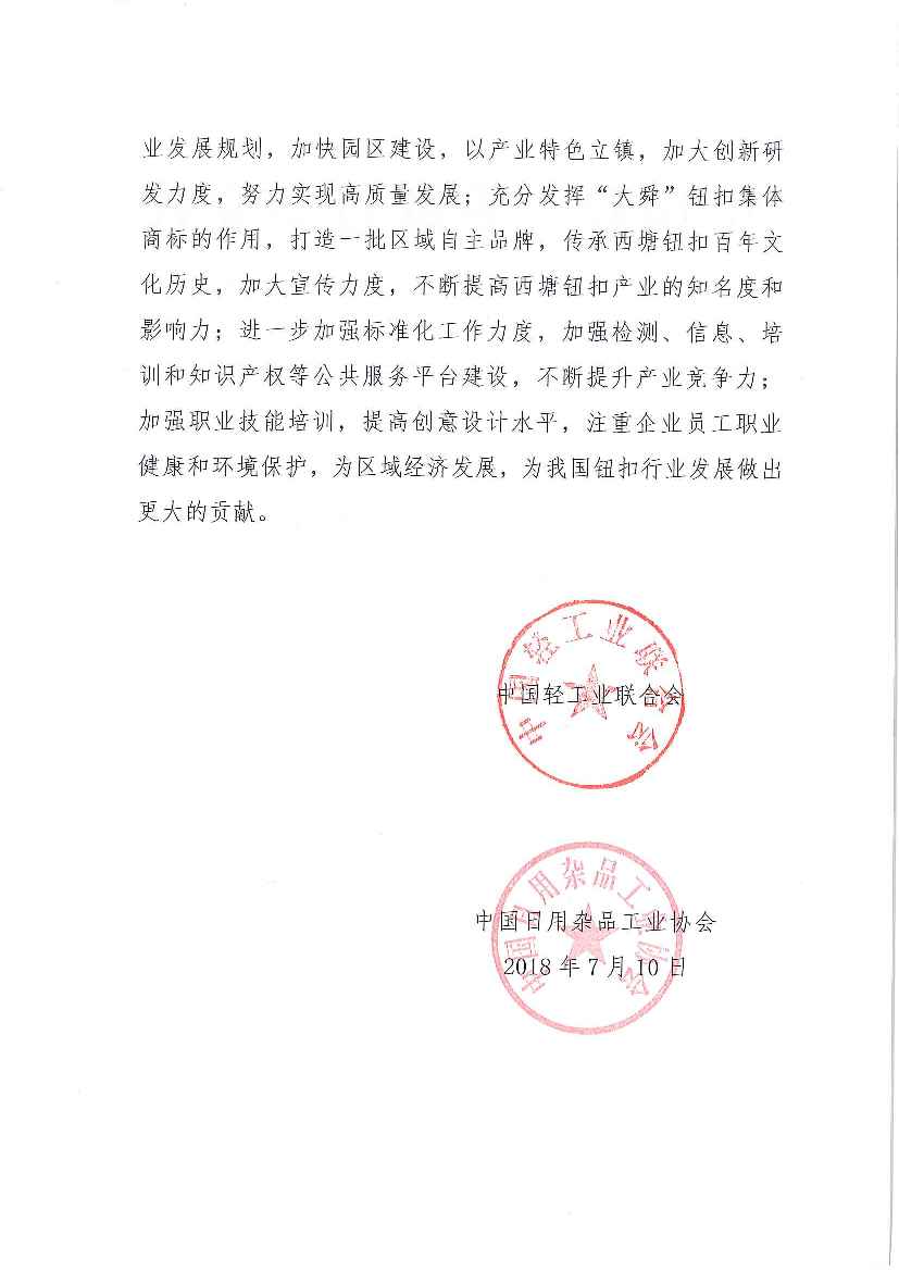 关于授予浙江省嘉兴市嘉善县西塘镇“中国钮扣产业基地•西塘”称号的通知