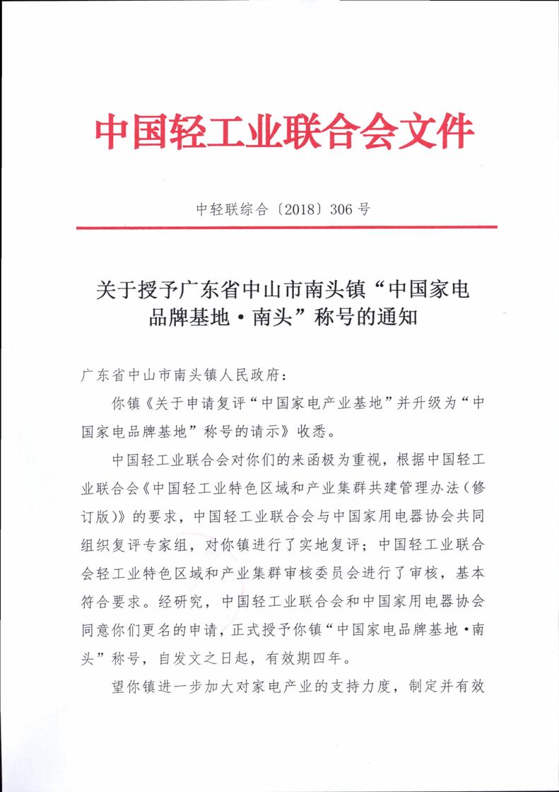 授予广东省中山市南头镇“中国家电品牌基地·南头”称号
