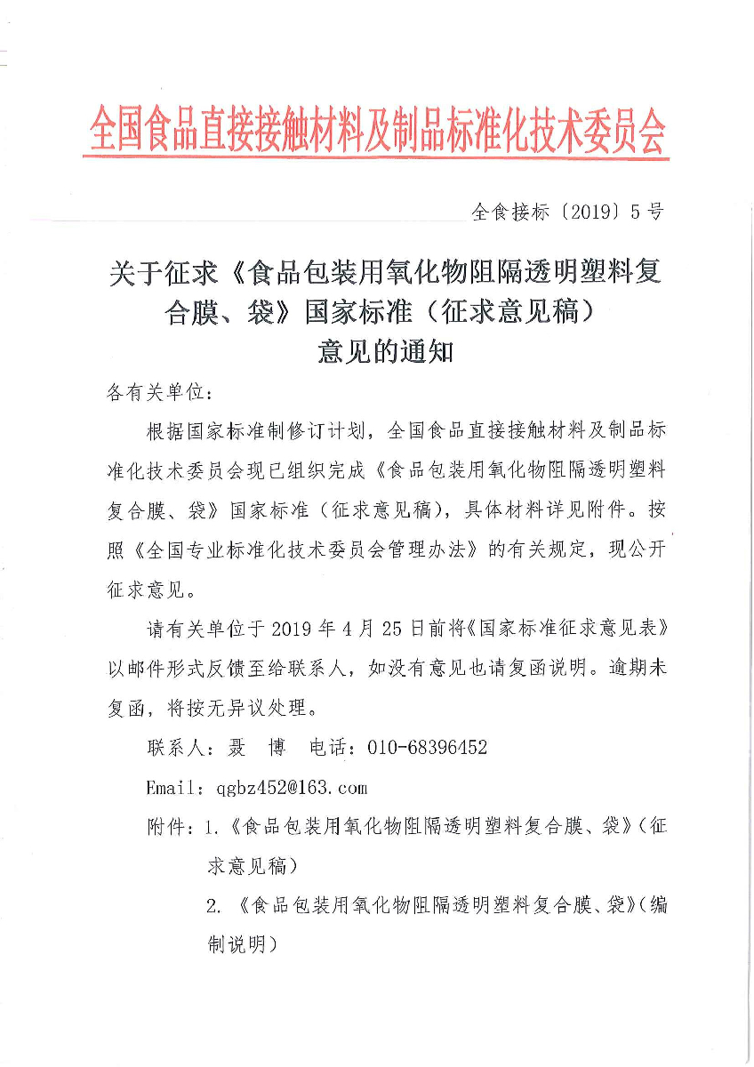 关于征求《食品包装用氧化物阻隔透明塑料复合膜、袋》国家标准(征求意见稿)意见的通知
