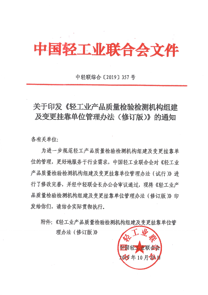 关于印发《轻工业产品质量检验检测机构组建及变更挂靠单位管理办法(修订版)》的通知