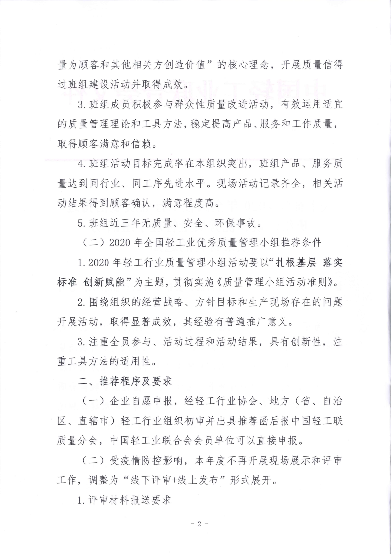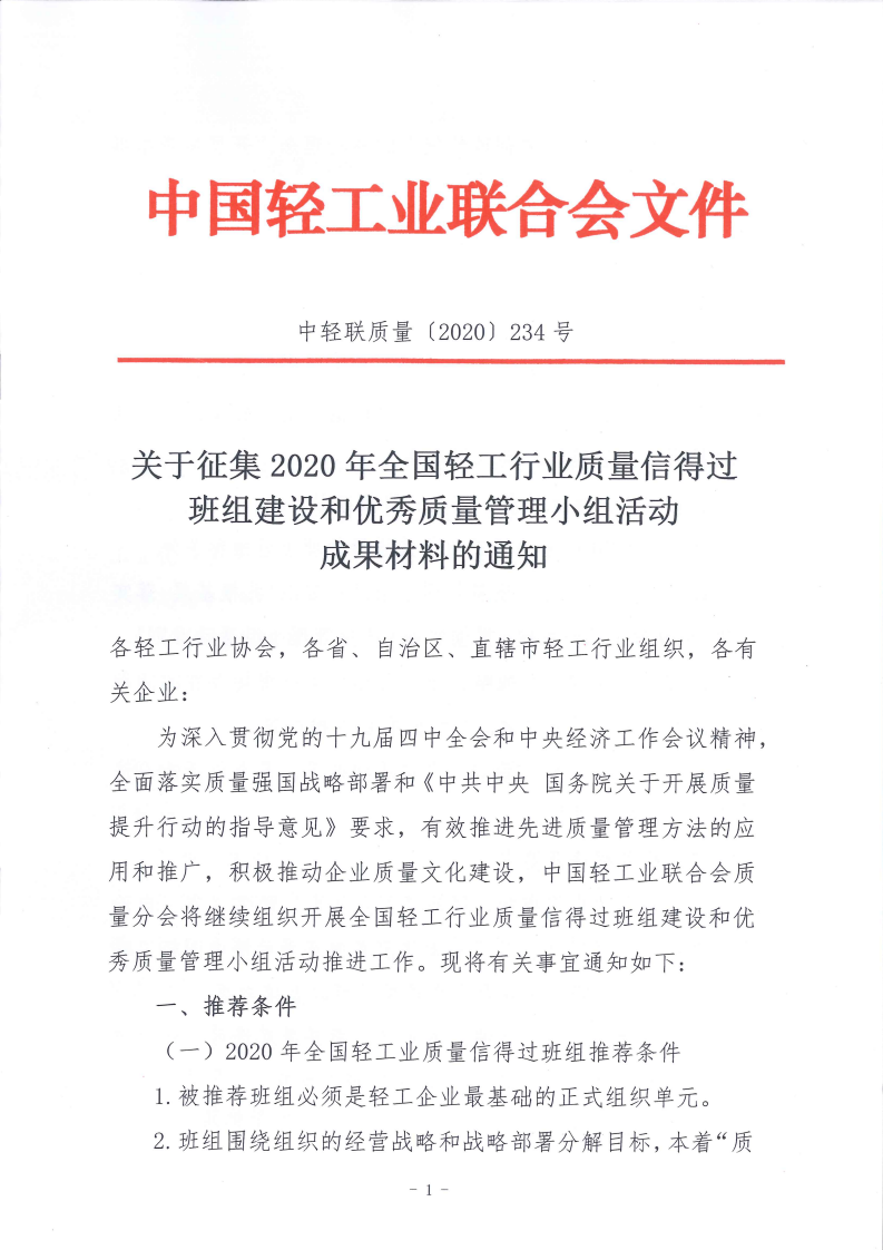 关于征集2020年全国 质量信得过班组建设和优秀质量管理小组活动成果材料的通知