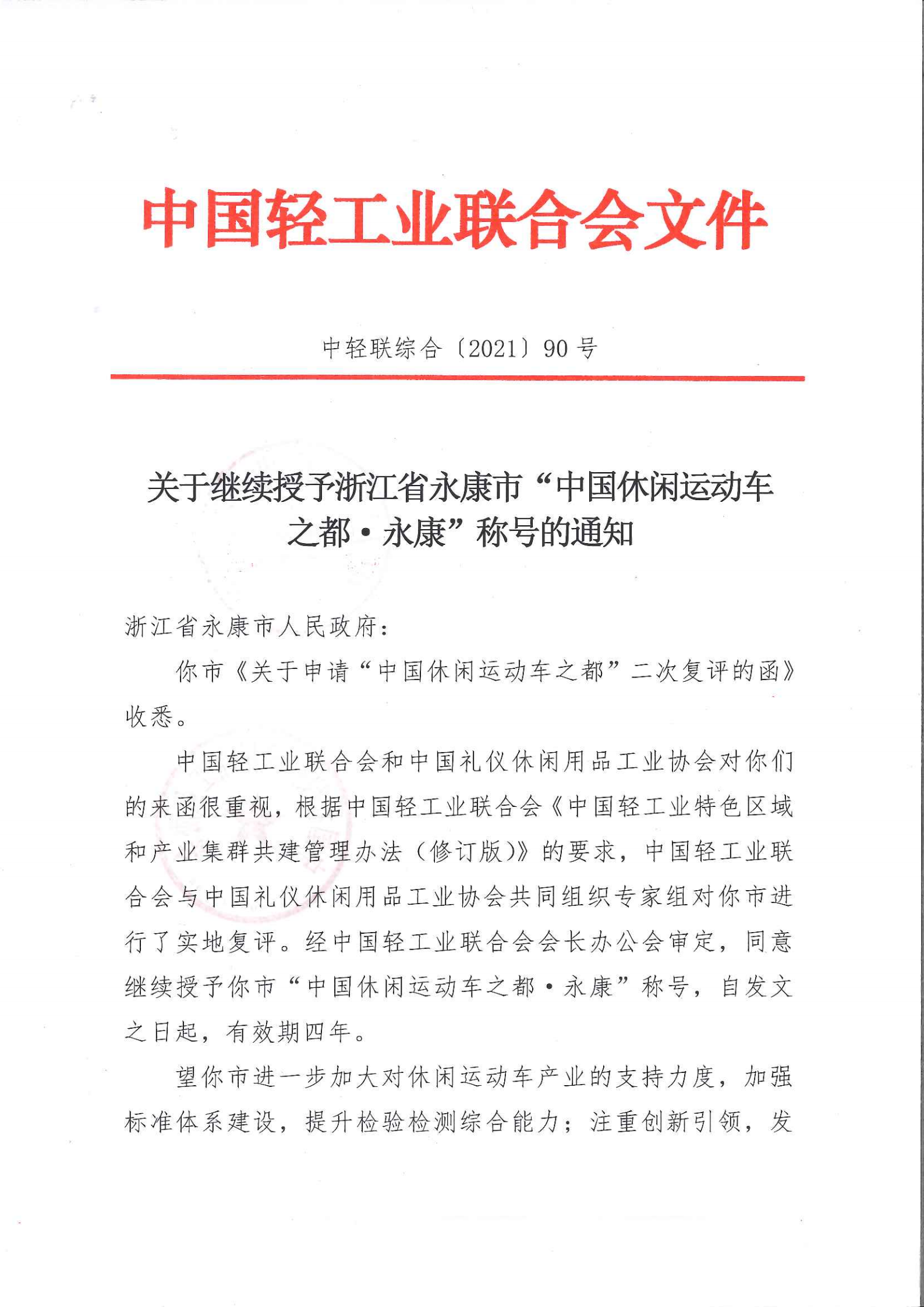 关于继续授予浙江省永康市“中国休闲运动车之都·永康”称号的通知